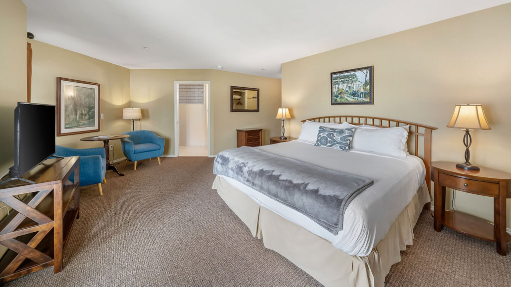 In our Bay View King Balcony room at Back Bay Inn, you’ll find spacious accommodations with a king bed and a private balcony offering stunning bay views. Enjoy the convenience of modern amenities and the refreshing ocean breeze during your stay, making it a comfortable and rejuvenating experience on California’s beautiful coastline.