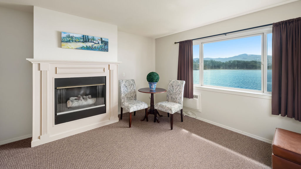 In our Bay View King Fireplace room at Back Bay Inn, you’ll find spacious accommodations with a king bed, fireplace and stunning bay views. Enjoy the convenience of modern amenities and the refreshing ocean breeze during your stay, making it a comfortable and rejuvenating experience on California’s beautiful coastline.