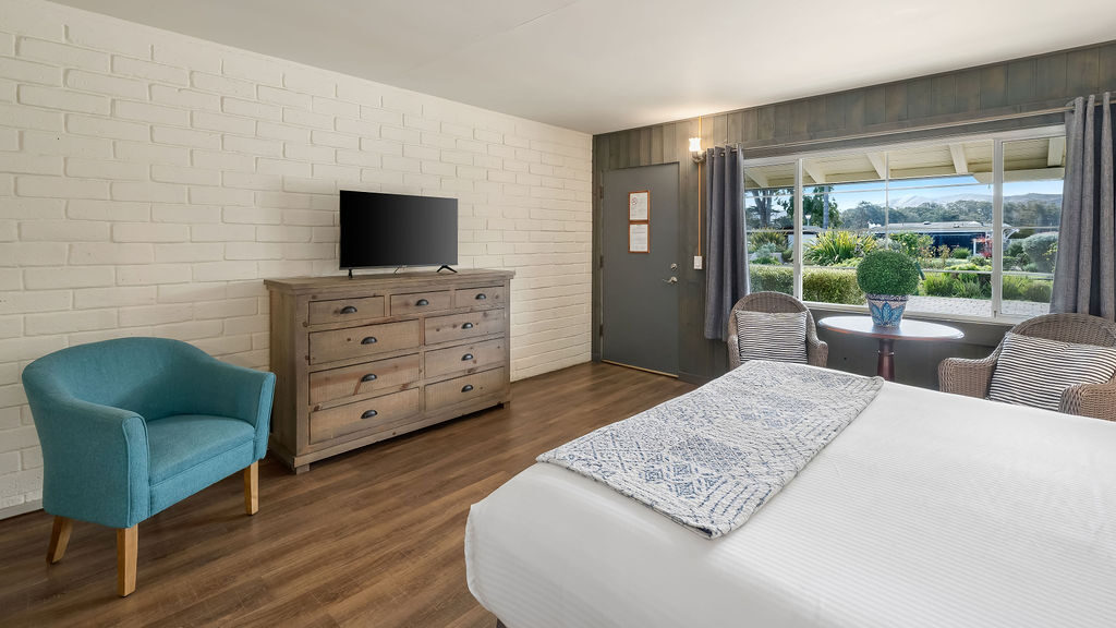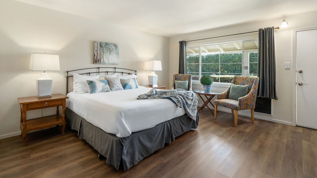 Nestled within our lush landscaped gardens, the Cypress King rooms offer a serene retreat, surrounded by the beauty of nature. These cozy rooms feature a comfortable king bed with soft linens, ensuring a restful night’s sleep. If you require extra sleeping arrangements, cots are available upon request. Please note that this room is pet-friendly.