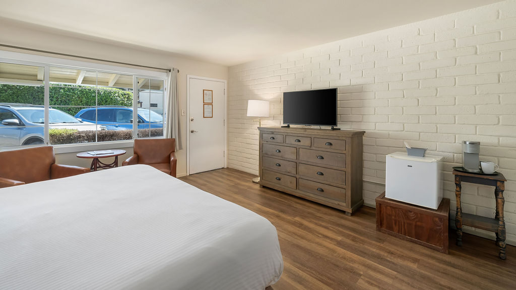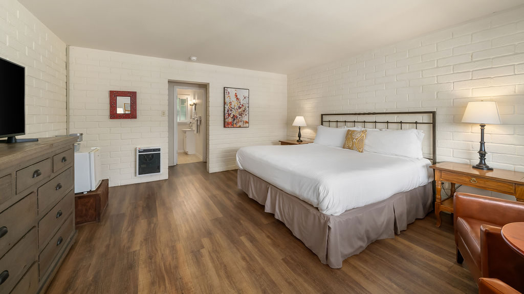 Nestled within our lush landscaped gardens, the Cypress King rooms offer a serene retreat, surrounded by the beauty of nature. These cozy rooms feature a comfortable king bed with soft linens, ensuring a restful night's sleep. If you require extra sleeping arrangements, cots are available upon request. Please note that this room is pet-friendly.